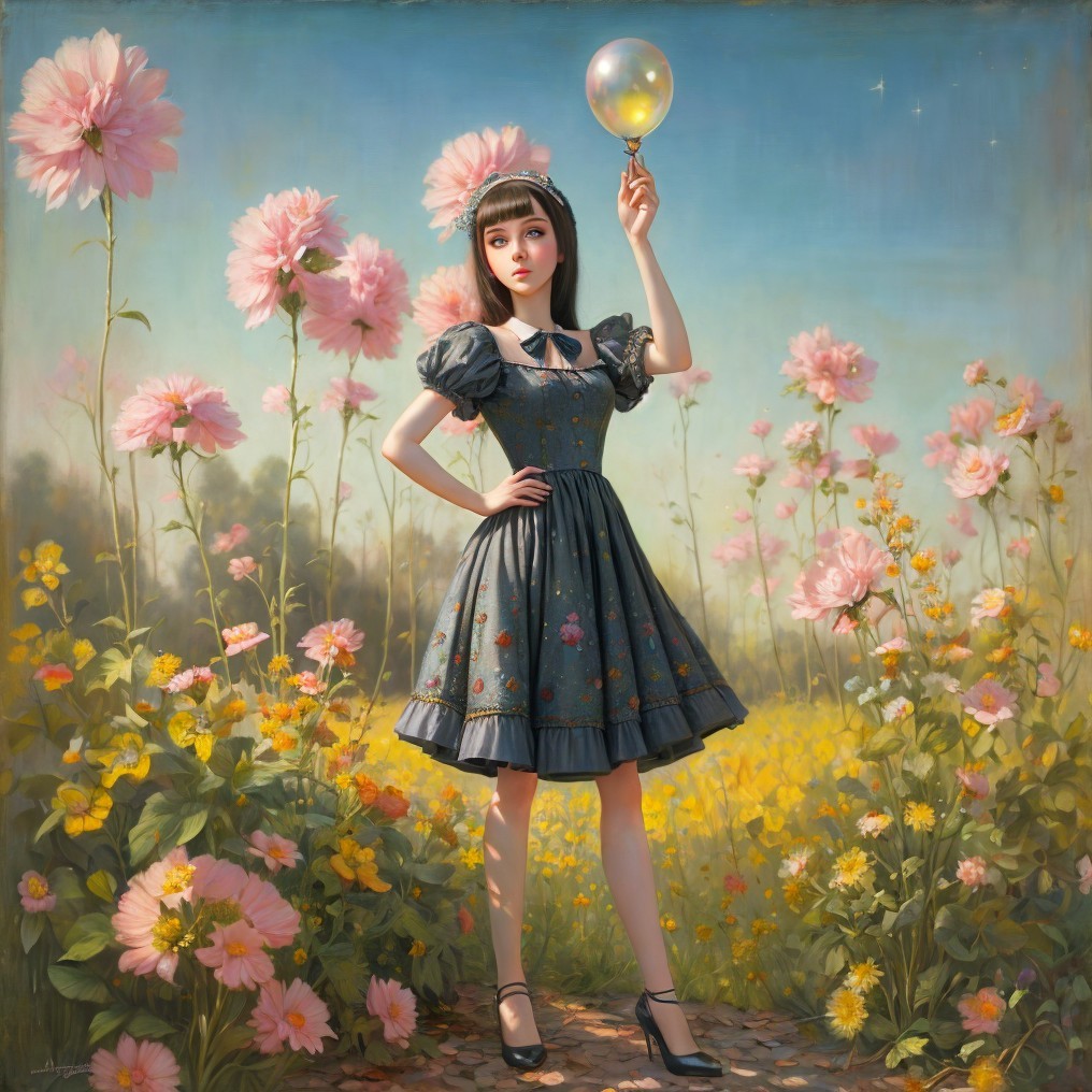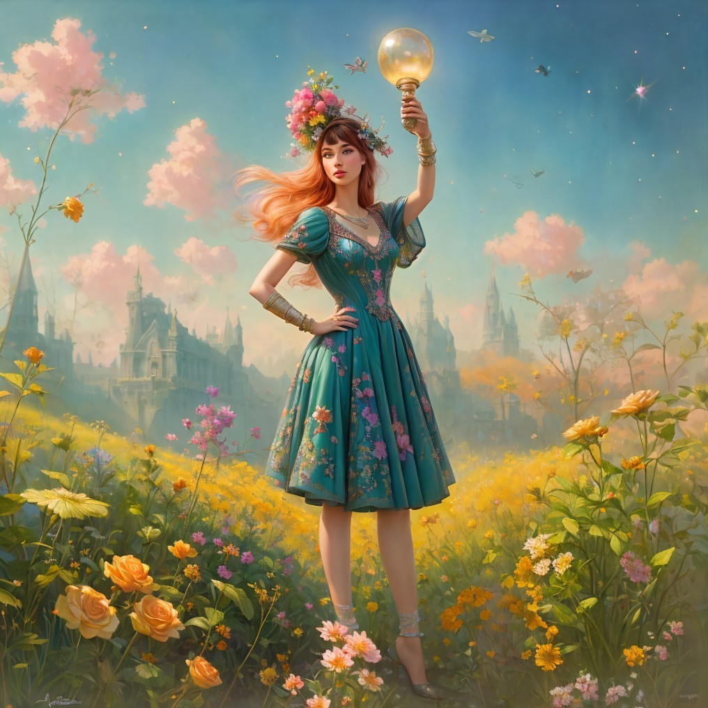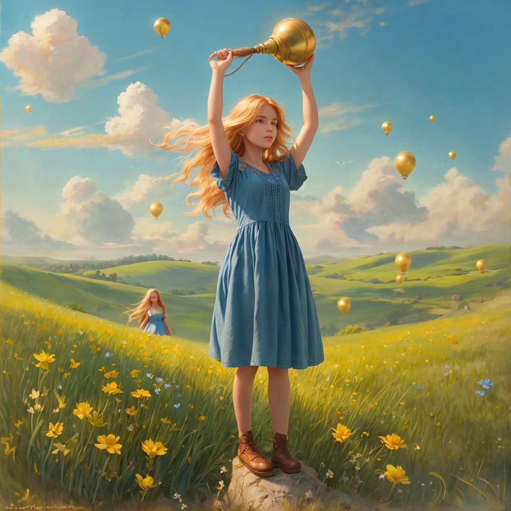 + Prompt:little girl with blond reddish wavy hair in a blue cotton dress is standing on the top of a grassy mound, one of her arms up above her head, girl is pulling on a thin rope tightened to a huge golden bell up in the blue beautiful sky, sunny landscape, Greg Rutkowski Tom Bagshaw Daniel Gerhartz Anne Bachelie, Embroidery by Flora Bowley and Jennifer Lommers and Enki Bilal, heavenly ,intricate, Dee Nickerson sterne Professional photography, bokeh, natural lighting, canon lens, shot on dslr 64 megapixels sharp focus