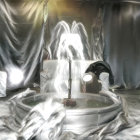 A mystical scene featuring ethereal statues with ghostly white faces, surrounded by shimmering water and illuminated by radiant beams of light, creating an enchanting and serene atmosphere.
