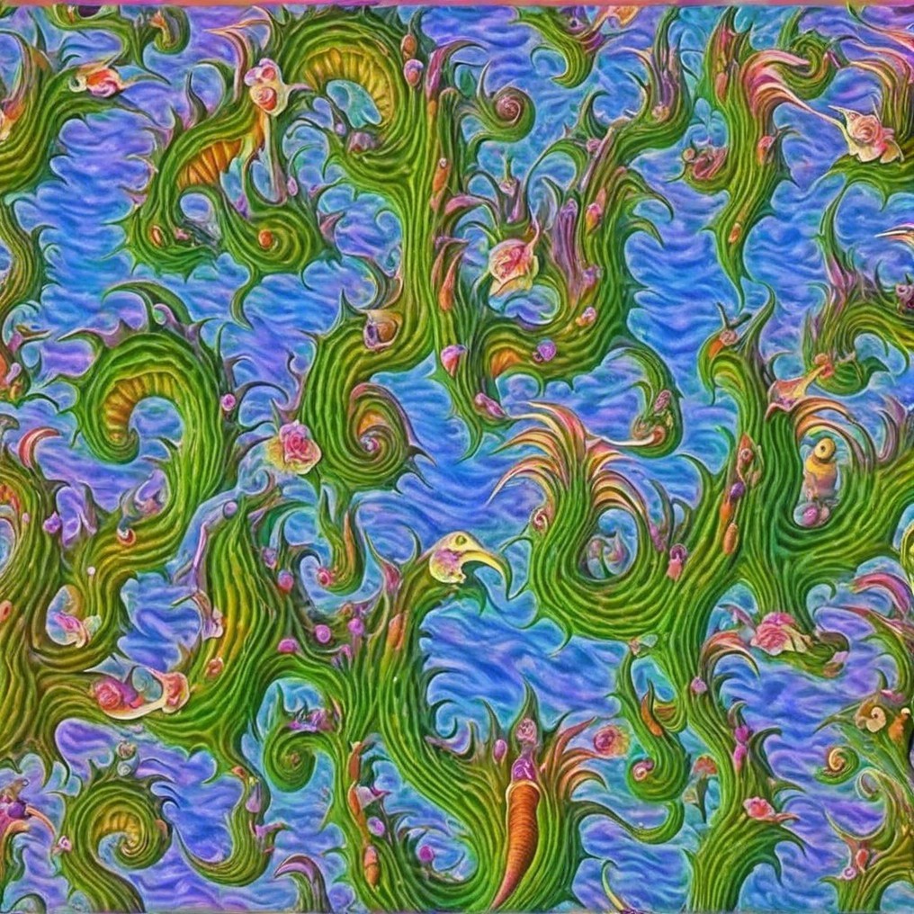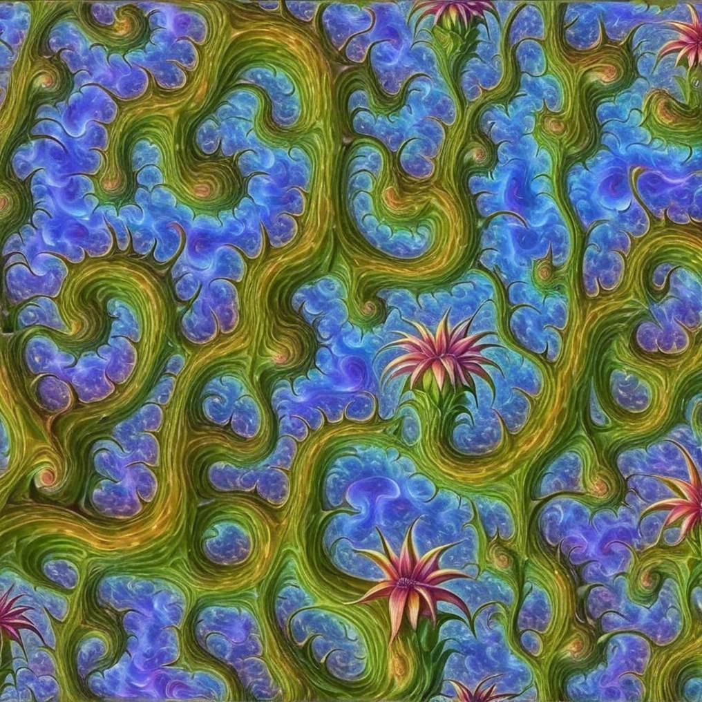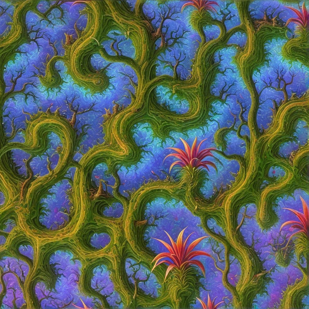A vibrant, intricate scene featuring twisting vines and lush foliage bathed in blue and purple hues. Bright orange and pink flowers emerge, adding pops of color to the enchanting forest backdrop.