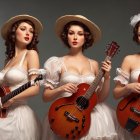 Three elegantly styled women in serene underwater attire, each holding a guitar. They wear vintage-inspired space helmets and are accompanied by small, adorable animals, creating a whimsical atmosphere.