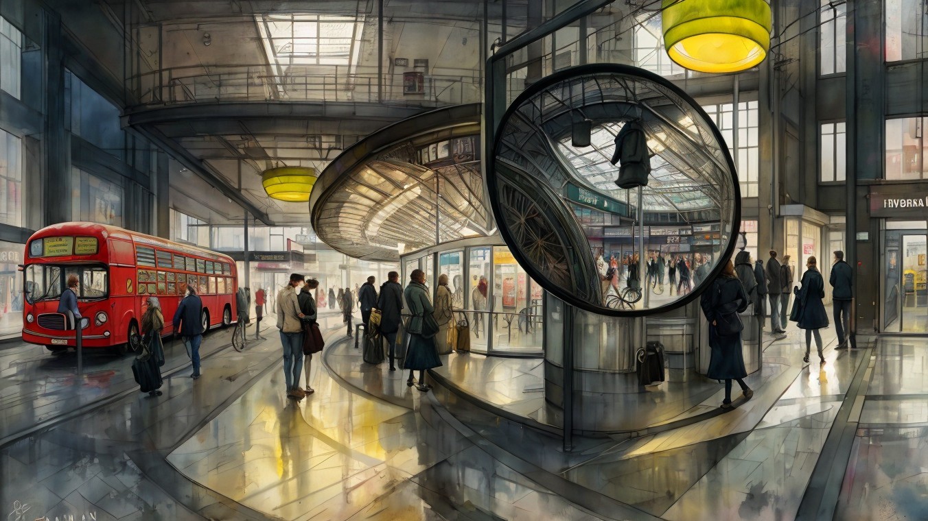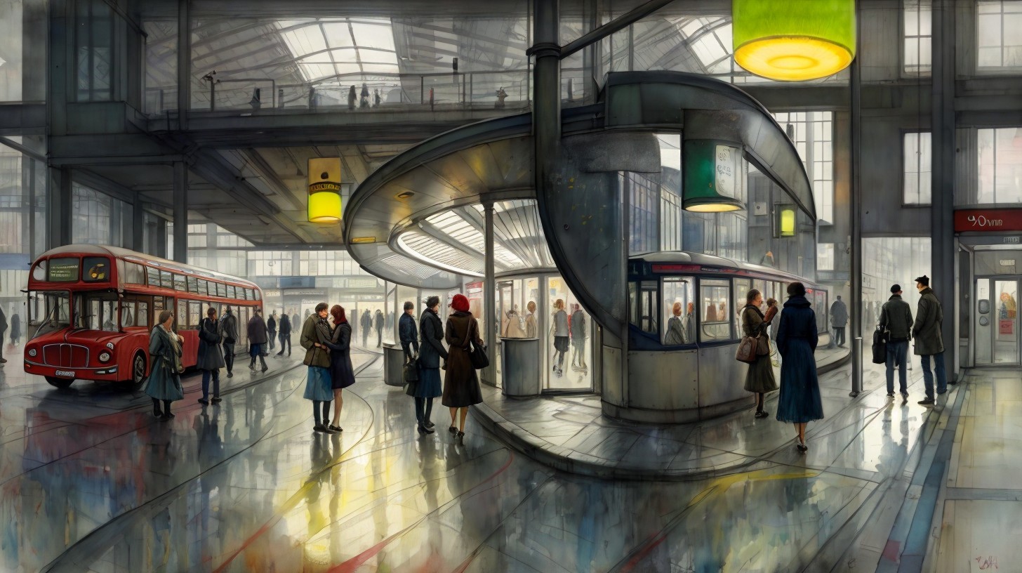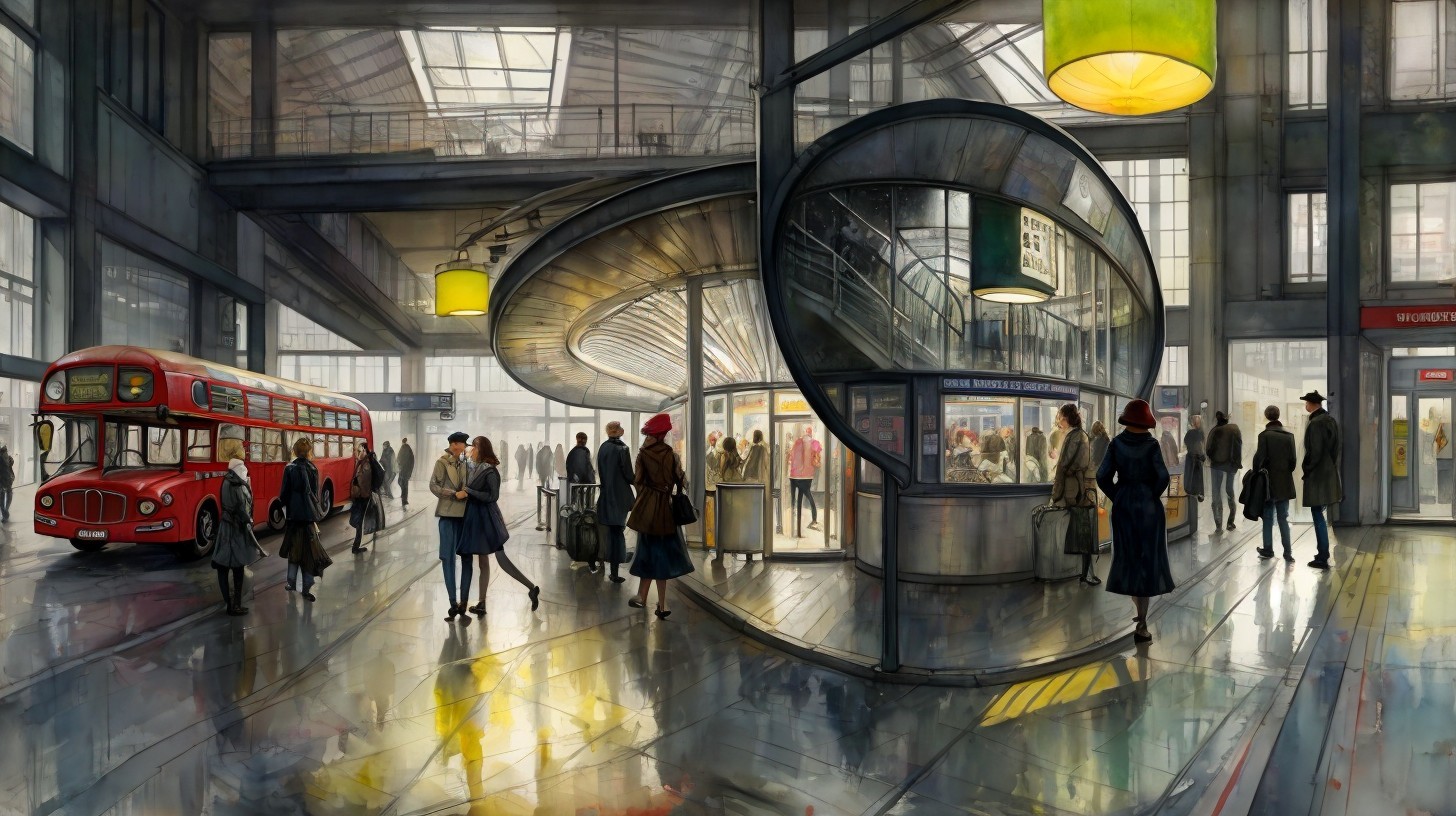 Prompt: Illustration described with circular lines drawings of a bus station in london, in watercolor style of Jeremy Mann, Dee Nickerson and style of Louis Jover, hdr