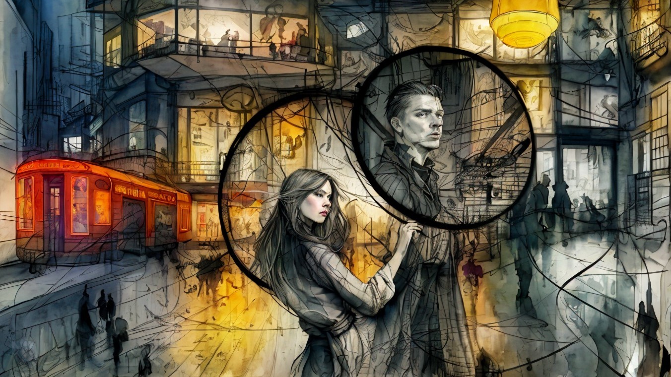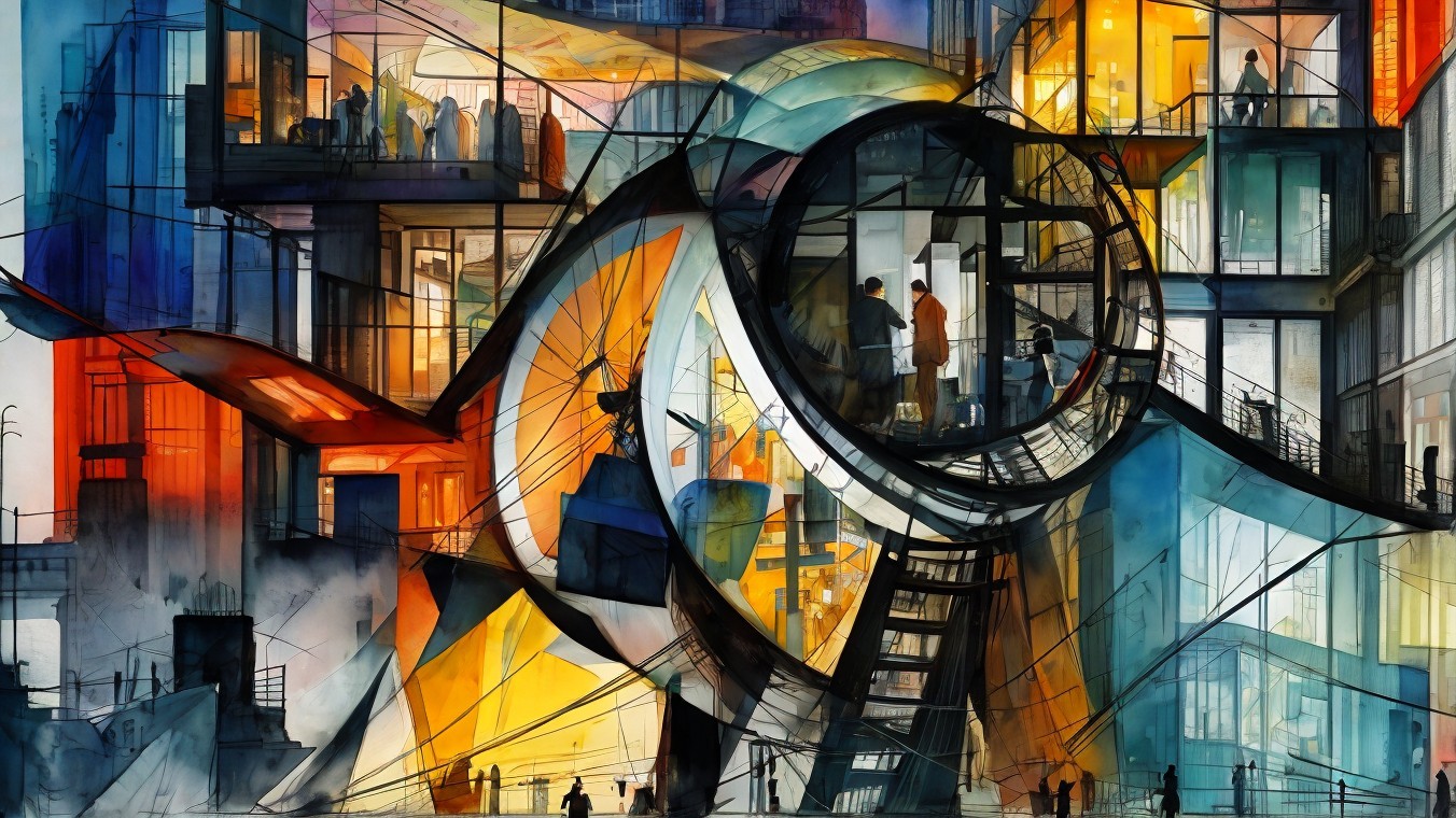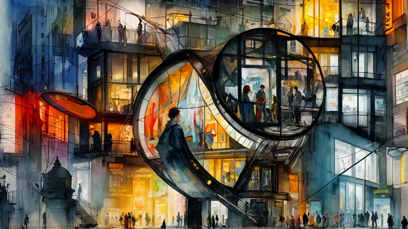 + Prompt:Illustration described with circular lines drawings of a citycsape in watercolor style of Jeremy Mann, Dee Nickerson and style of Louis Jover, hdr
