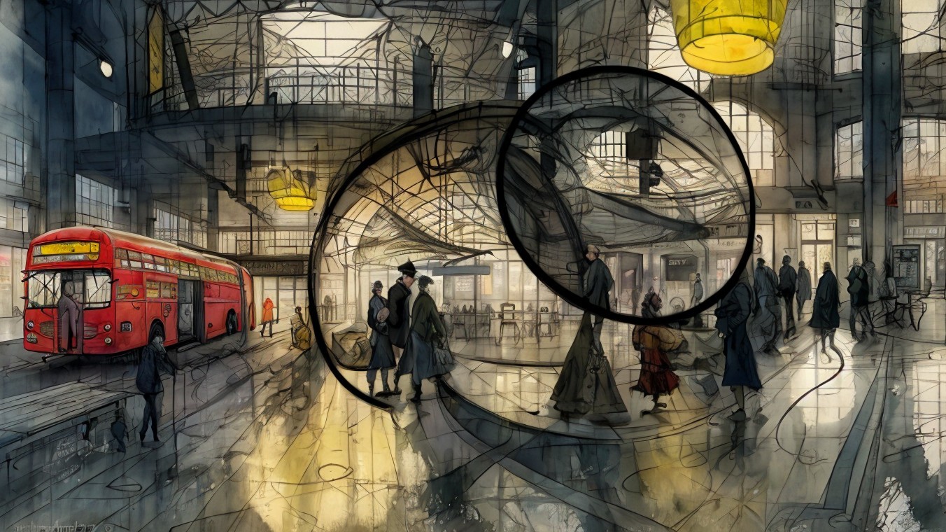 Illustration described with circular lines drawings of a bus station in london, in watercolor style of Jeremy Mann, Dee Nickerson and style of Louis Jover, hdr