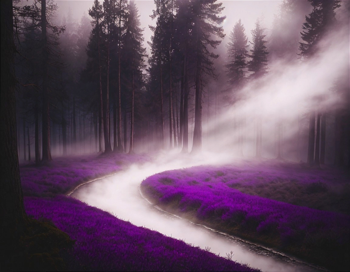 A serene forest scene features a winding river surrounded by vibrant purple flowers. Mist gently rises among tall trees, creating a mystical and tranquil atmosphere.