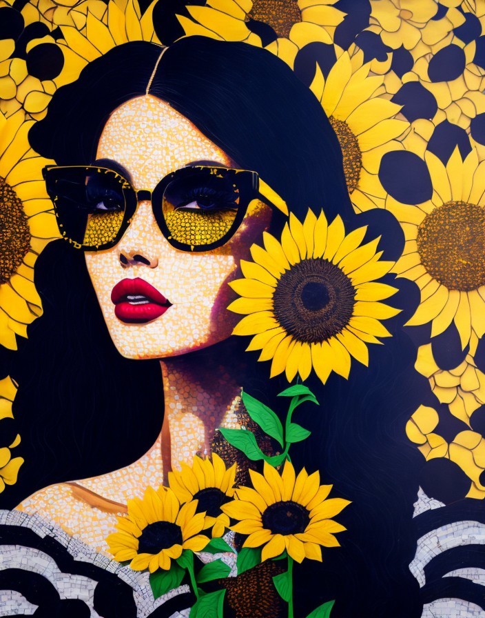 A vibrant illustration of a woman with sunglasses surrounded by sunflowers.