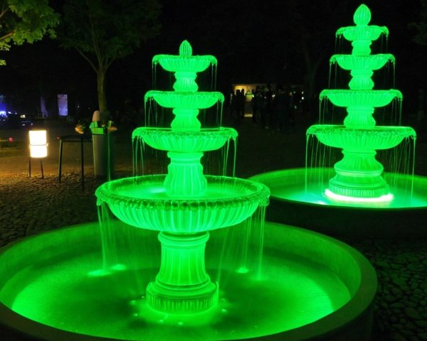 A stunning sunset scene features a fountain with illuminated streams of water, set against a backdrop of mountains and a tranquil lake, creating a serene and picturesque atmosphere.