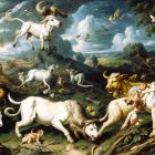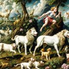 In a vibrant mountain landscape, a joyful woman in a yellow dress leads a pack of white dogs, surrounded by cheering people and soaring birds, capturing a spirit of freedom and happiness.