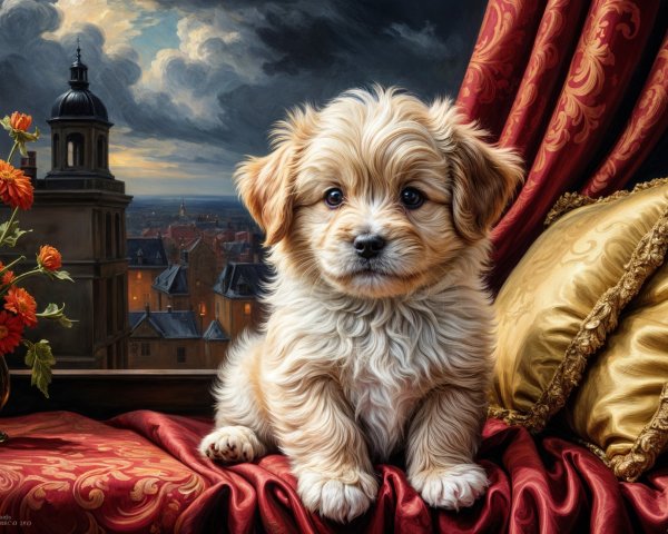 A young woman with elegantly styled vintage curls gazes thoughtfully, wearing a shimmering gold dress adorned with intricate details, set against a richly decorated background.