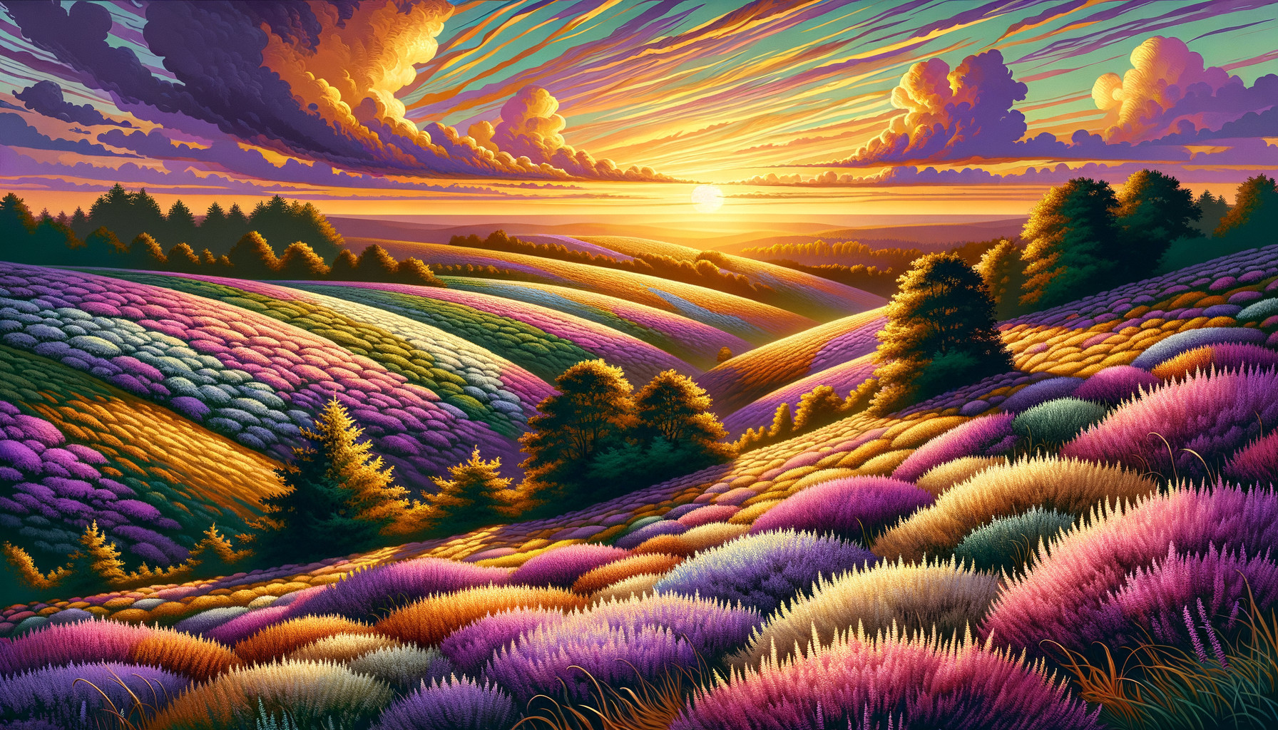 A colorful, stylized landscape with vibrant  heather fields under a dramatic sunset and rolling hills.