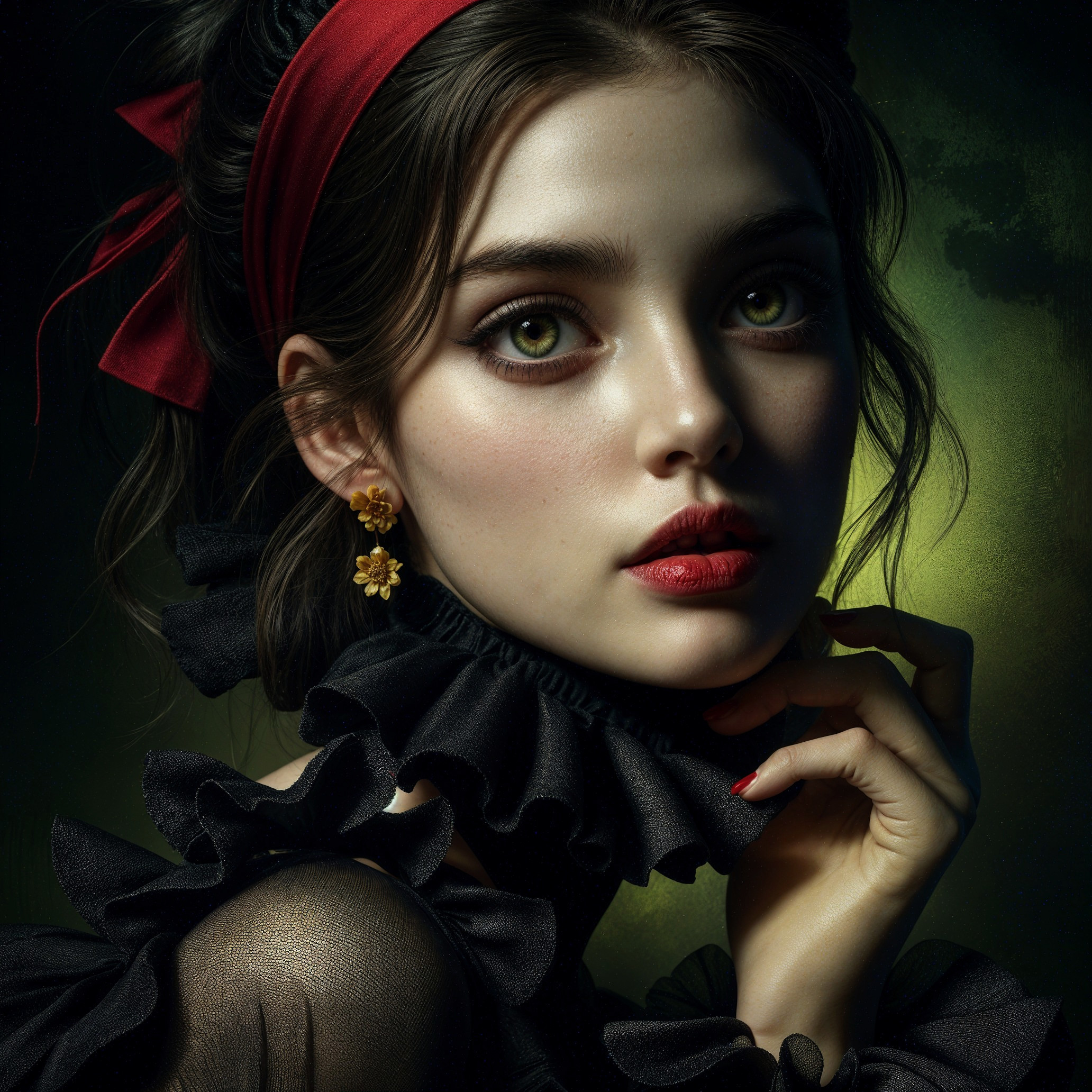 The image features a close-up of a young woman with striking green eyes and dark, dramatic makeup. She wears a ruffled black outfit and red accessories, set against a moody green background.