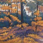 Prompt: Create a detailed intaglio print in the style of Phil Greenwood depicting a walnut tree after its leaves have turned yellow with red spots and with one single blue jay who has perched there.