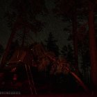A woman poses gracefully on a car roof under a starry night sky, surrounded by tall trees. The Milky Way glimmers above, creating a captivating and ethereal atmosphere.