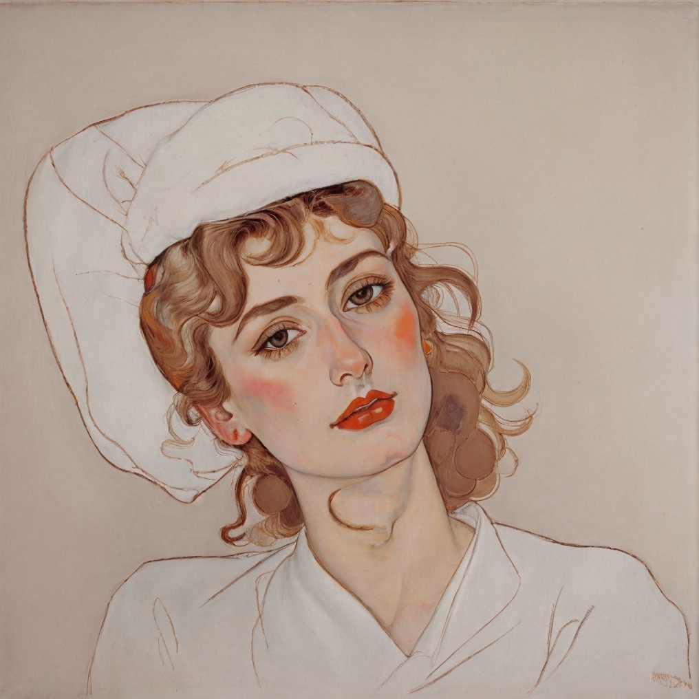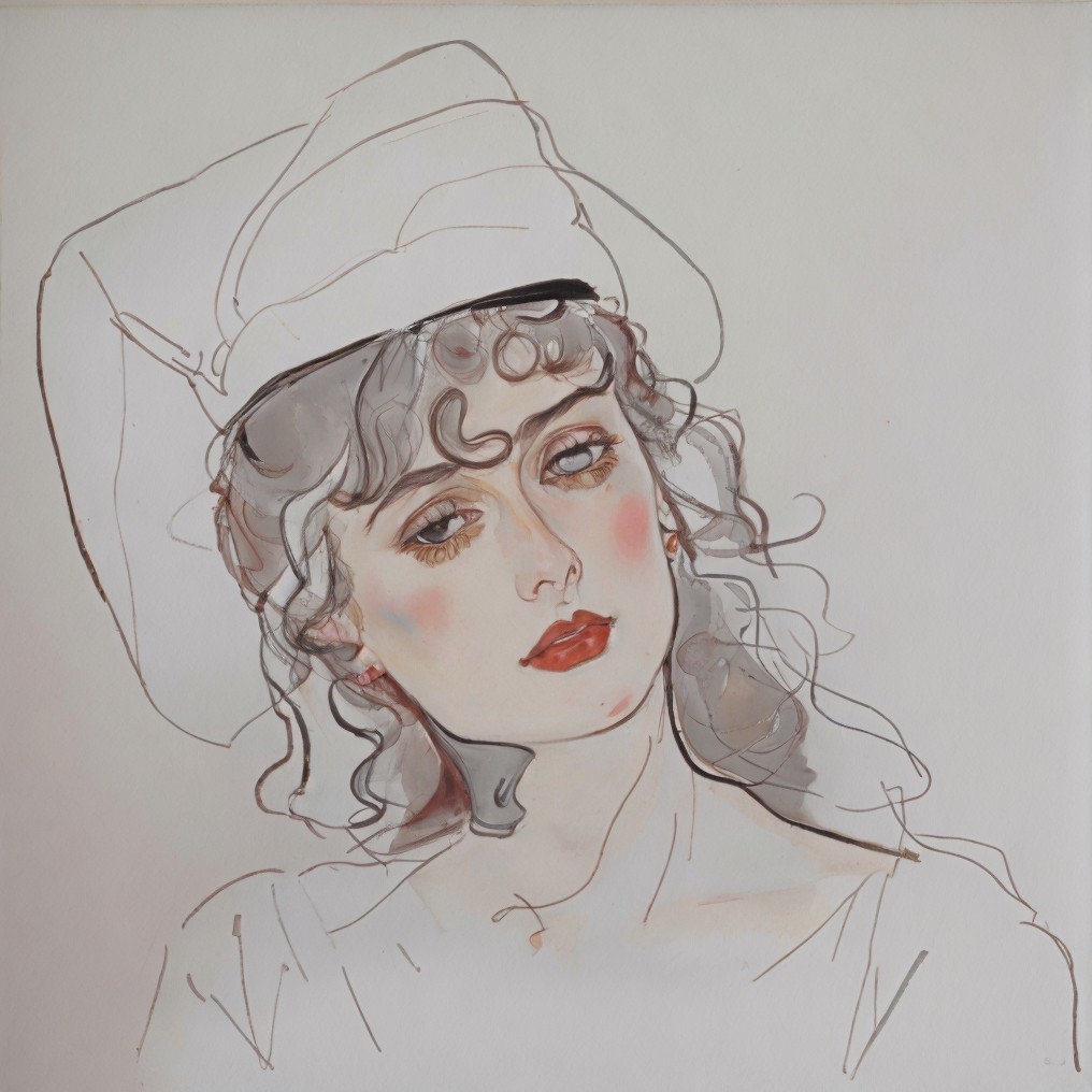 A painting of a woman with red hair, striking blue eyes, and a white hat, gazing intensely.