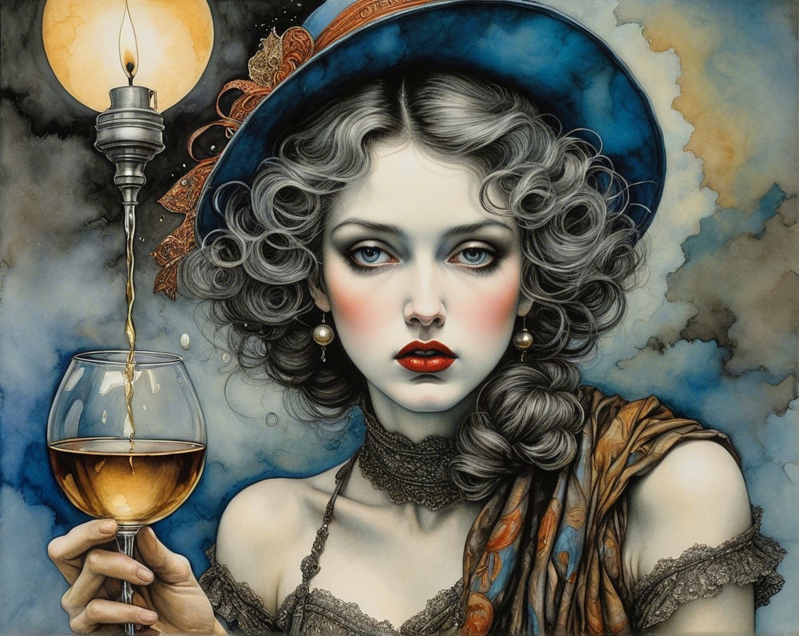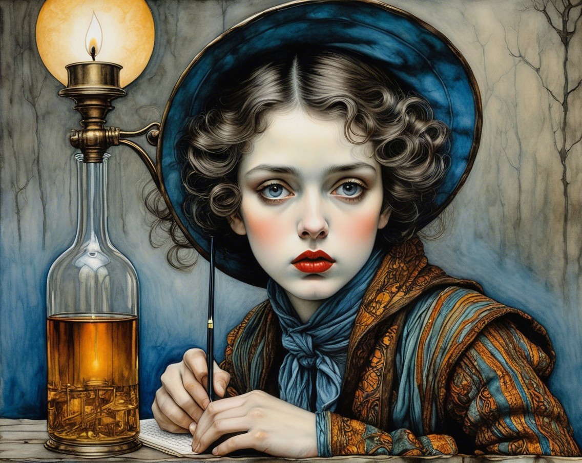 A young girl with curly hair sits at a table, gazing intently. She holds a pen, with a lantern glowing nearby, casting a warm light in a softly colored, artistic setting.