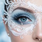 A close-up of a stunning eye adorned with vibrant blue makeup, shimmering silver accents, and decorative droplets, showcasing a captivating and artistic beauty style.