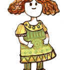 A whimsical cartoon girl with vibrant, curly orange hair and a colorful patterned dress featuring swirls and stripes. She stands cheerfully, showcasing her playful, artistic style.