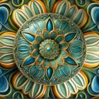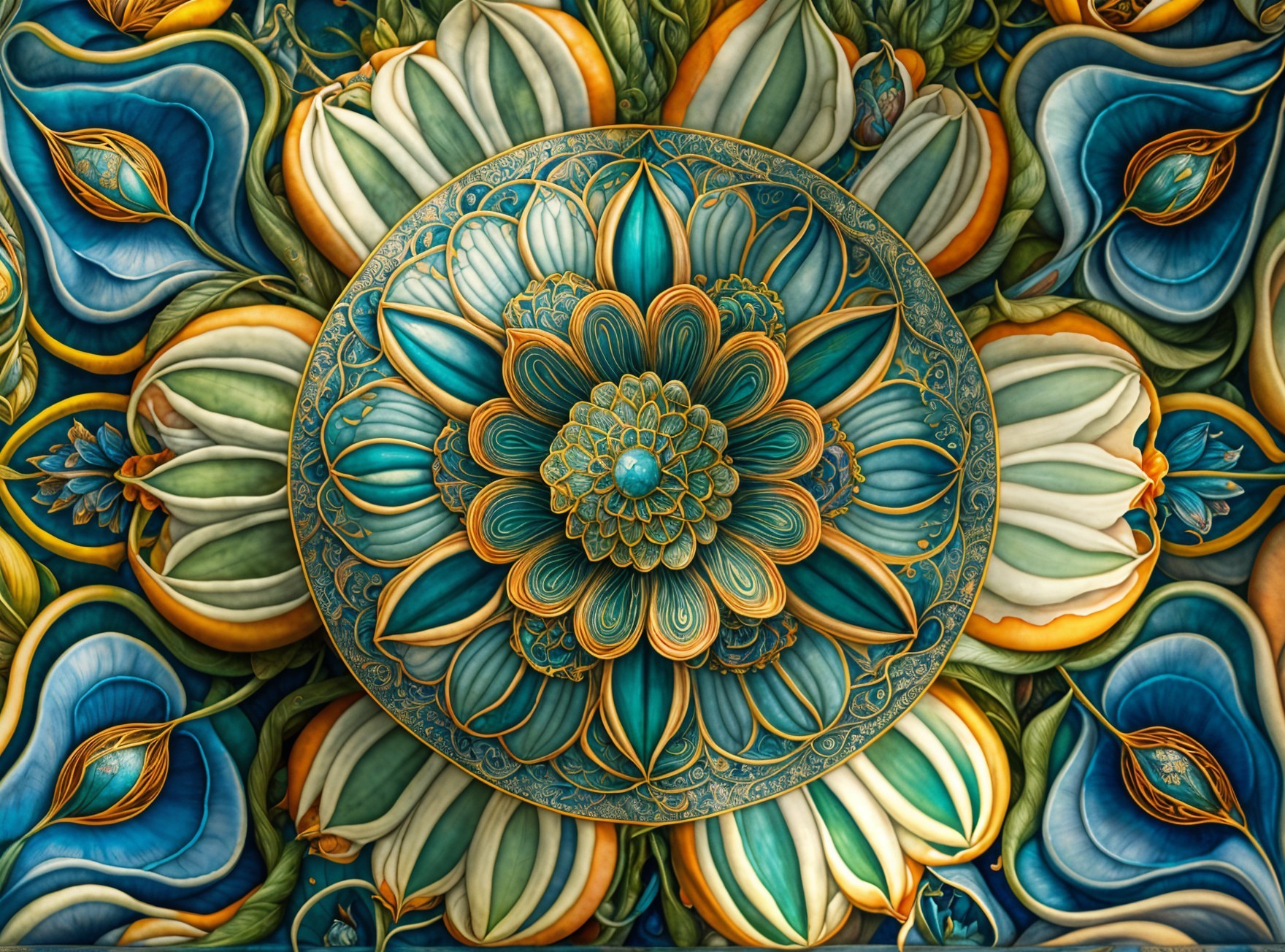 A vibrant, intricate design featuring a central flower motif surrounded by richly detailed petals and swirling patterns in shades of blue, green, and gold, evoking a sense of floral harmony.