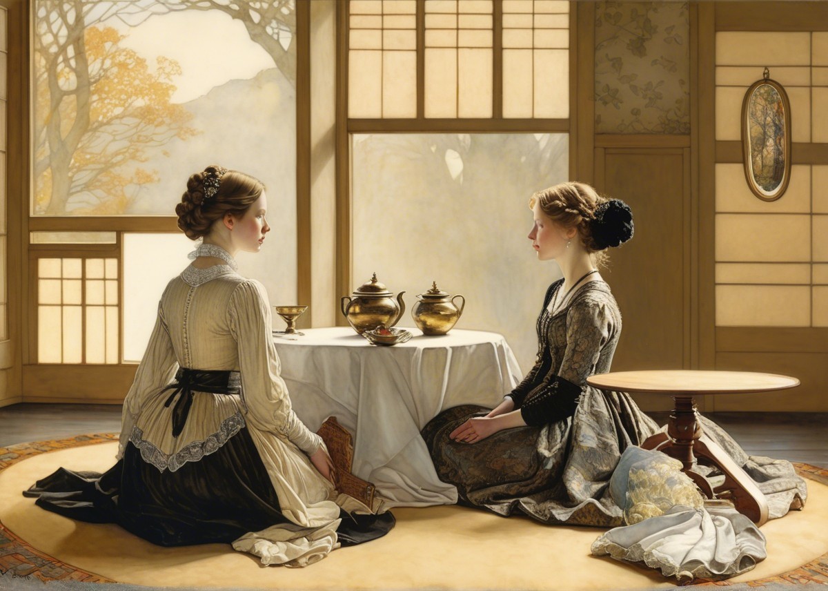 Two women in elegant, vintage dresses sit across from each other at a table, with serene expressions. Soft light filters through windows, highlighting their contemplative mood.