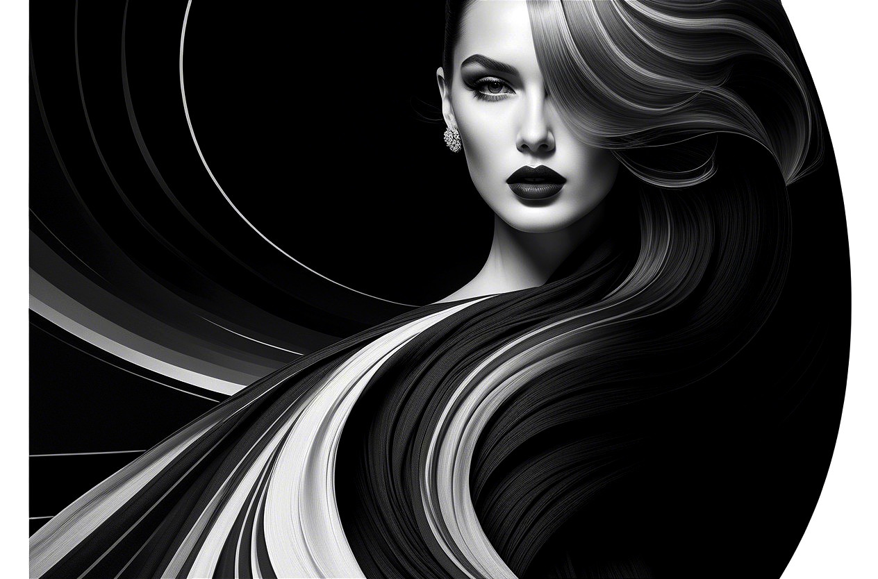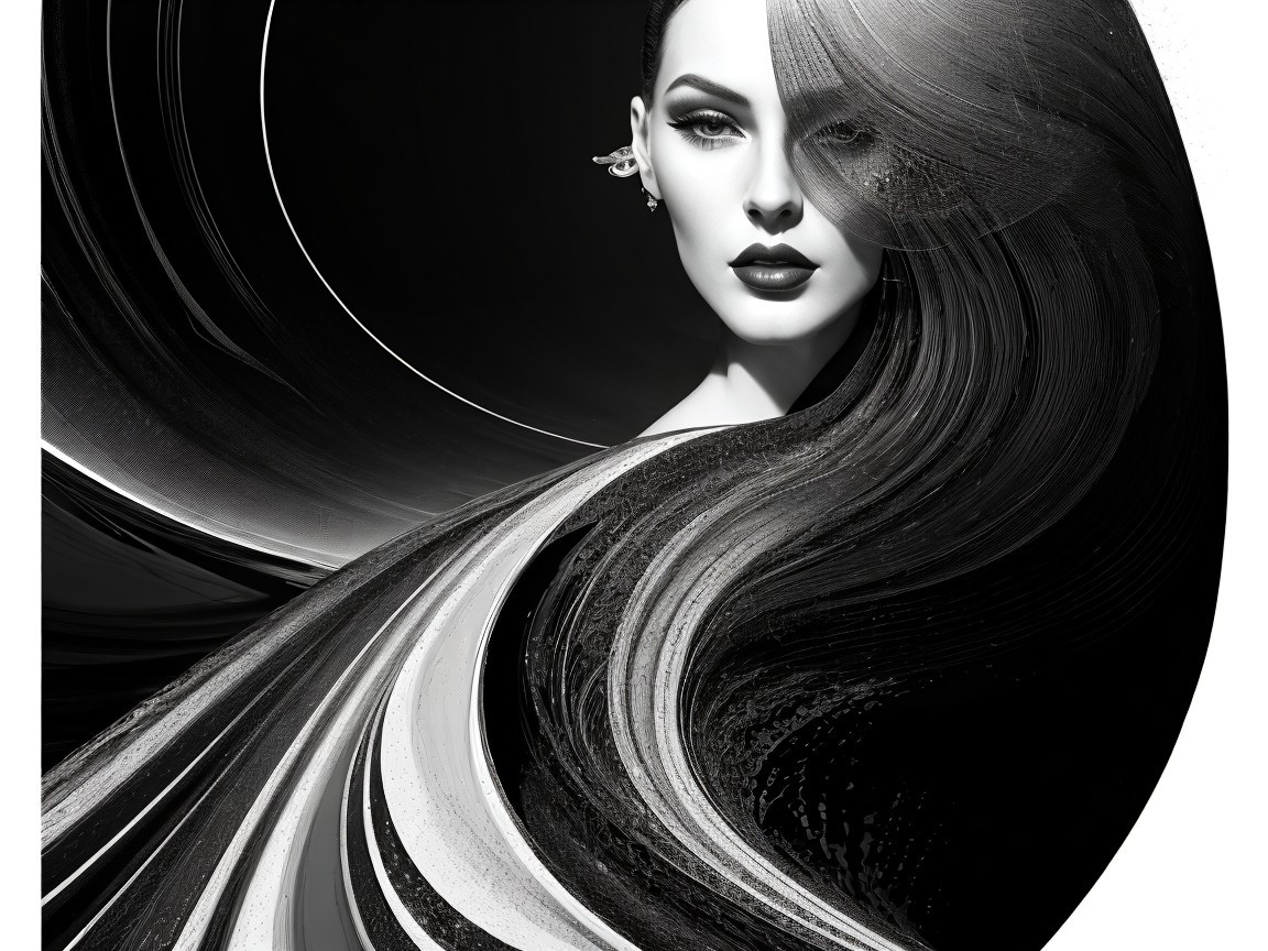 A striking black-and-white image features a glamorous woman with flowing hair and bold makeup, artistically integrated with swirling lines that enhance her sophisticated allure.