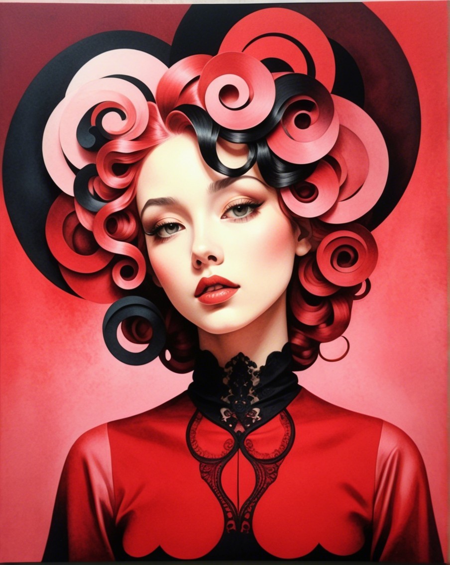 A stylized portrait of a woman with vibrant red curls and a striking expression. She wears a red outfit adorned with intricate lace, set against a soft gradient background.