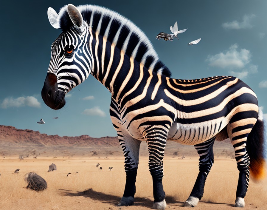 ("Try it" from Norman Dick) A vibrant digital painting of a zebra standing in a desert landscape under a clear blue sky.