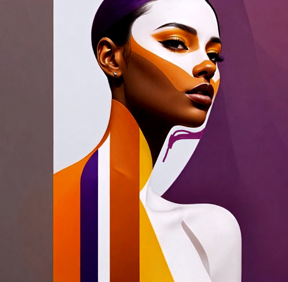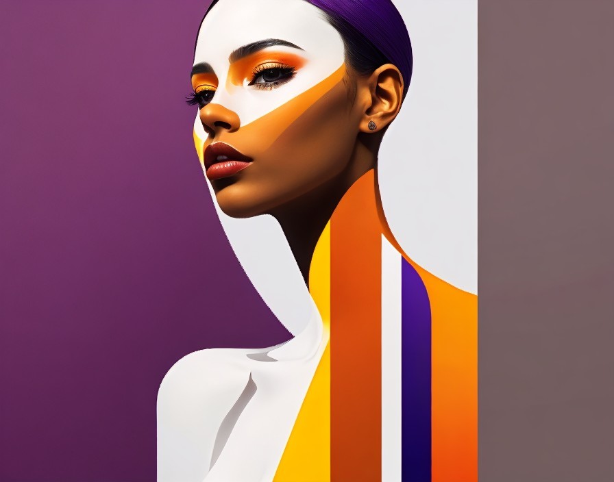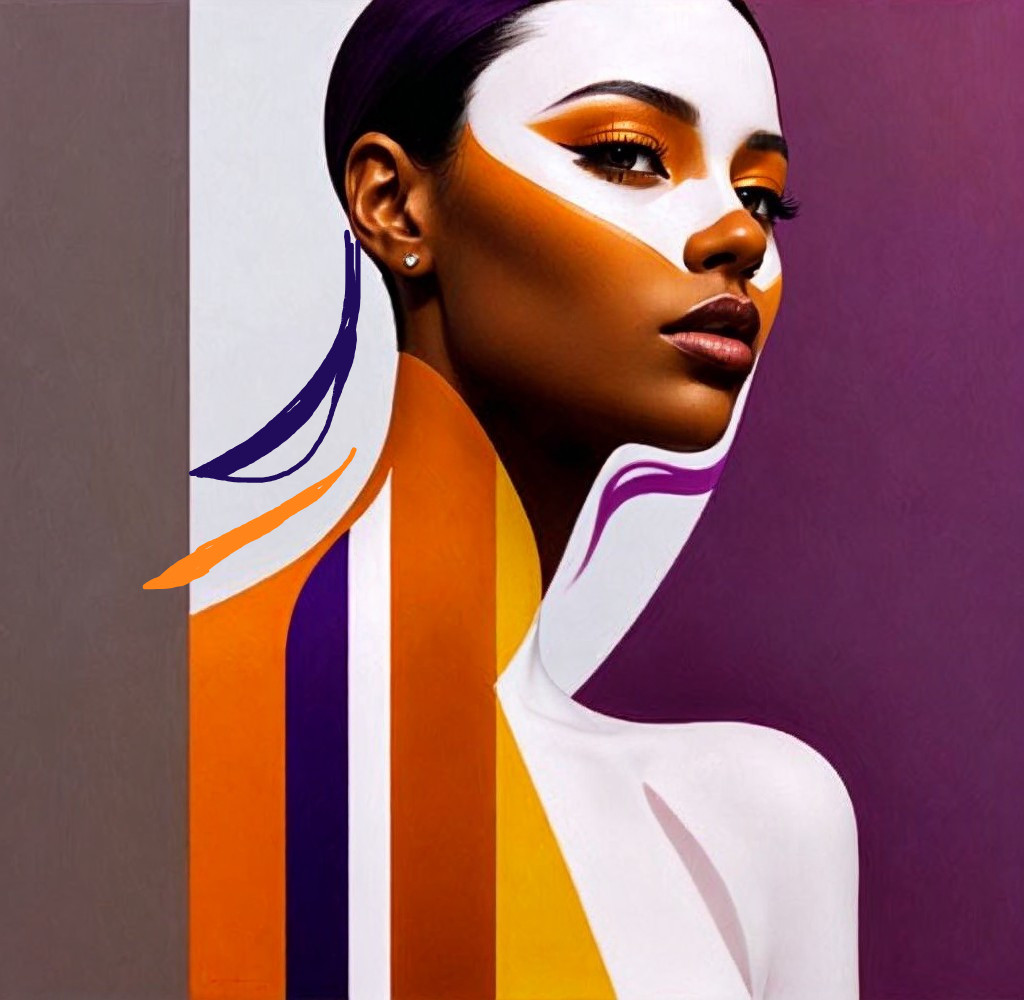 A stylized portrait of a woman with striking makeup, featuring bold orange and purple colors, and a modern, abstract design. Rework in Aieditor between step.