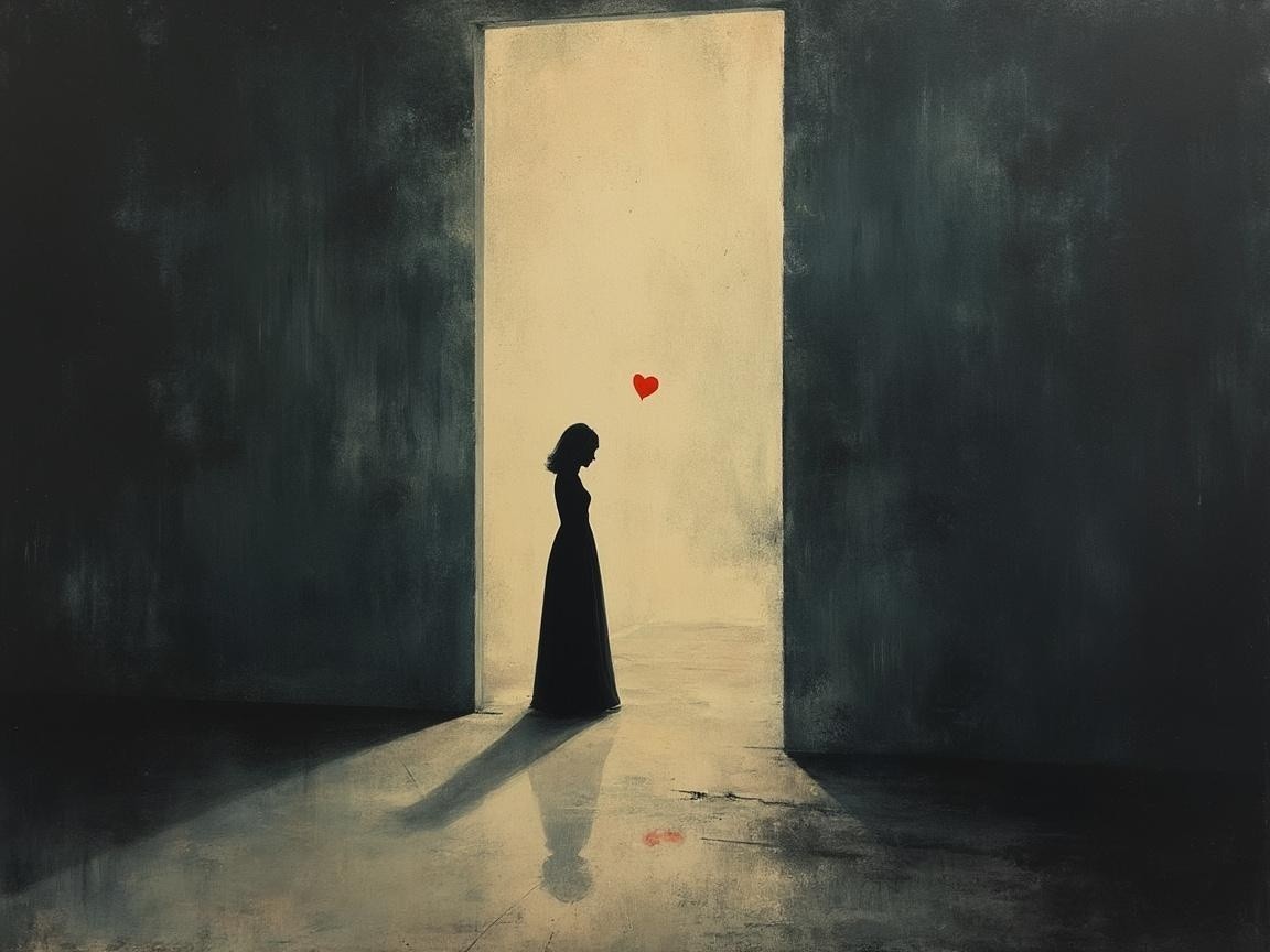 A figure in a long black dress stands in a softly lit doorway, holding a book. Light casts shadows, highlighting a staircase in the background, creating a serene and mysterious atmosphere.