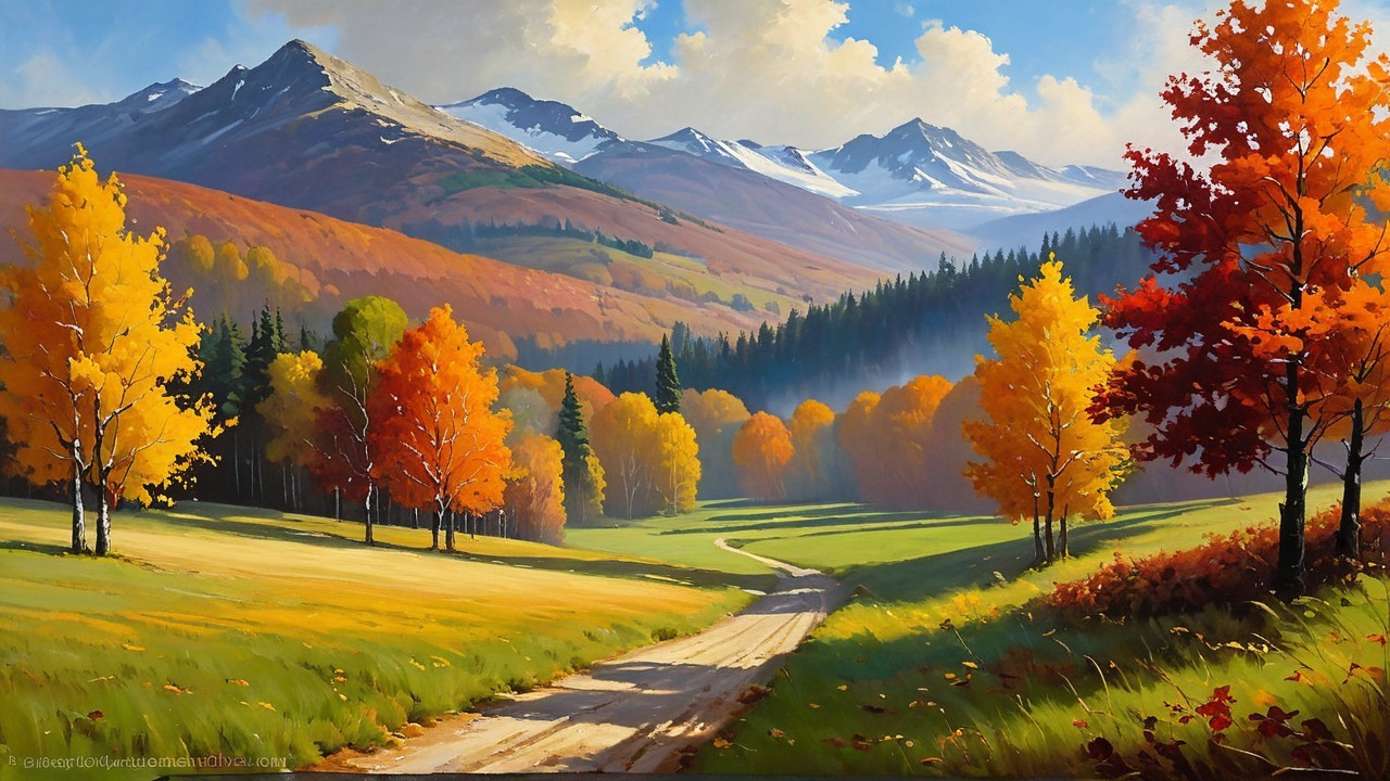 A vibrant autumn landscape features a quaint farmhouse surrounded by colorful trees, rolling hills, and majestic mountains under a bright blue sky, creating a serene and picturesque scene.