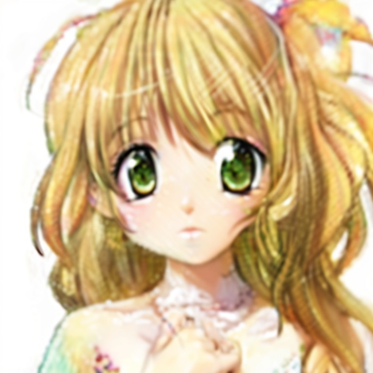 A cheerful character with long, wavy blonde hair adorned with colorful bows. She has bright, expressive eyes and a warm smile, set against a vibrant, sparkly pink background.