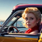 A stylish woman in a red dress and scarf sits in a classic yellow convertible, facing the water. The sun shines, reflecting off the car's chrome details, creating a vibrant, retro vibe.