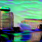 The image showcases a vibrant cityscape at night, featuring a futuristic building illuminated with colorful lights and cascading fountains, surrounded by glowing trees and a magical atmosphere.
