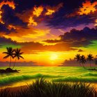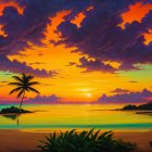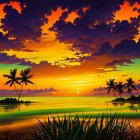 A breathtaking sunset paints the sky with vibrant oranges, purples, and blues, reflecting on calm waters. Silhouetted palm trees frame the scene, enhancing the tropical paradise atmosphere.