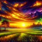 Prompt: "Create a picturesque tropical landscape painting featuring a vibrant sunset. The sky should be filled with rich hues of orange, yellow, and purple, with scattered clouds reflecting these colors. At the horizon, a brilliant sun sets, casting warm light over the scene. The foreground showcases a lush, green field bordered by silhouettes of trees, creating depth. Subtle details like small structures or tiki houses can be included in the background. The overall atmosphere should evoke serenity and the beauty of nature at dusk, with a painterly style that highlights brush strokes and texture.