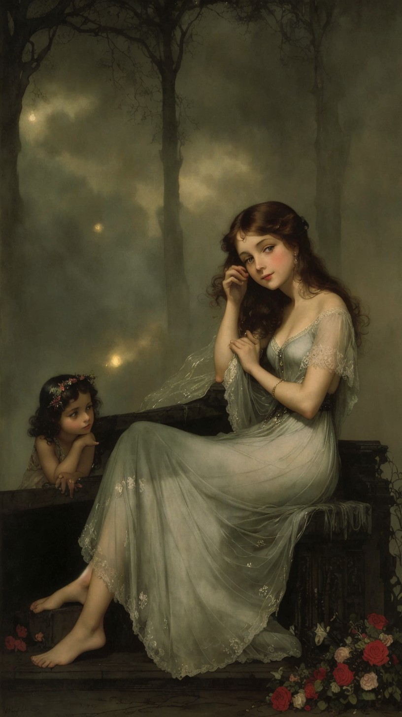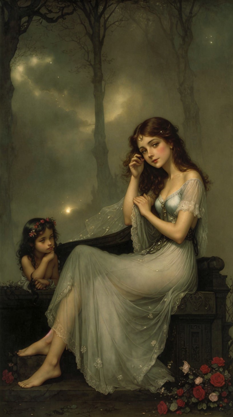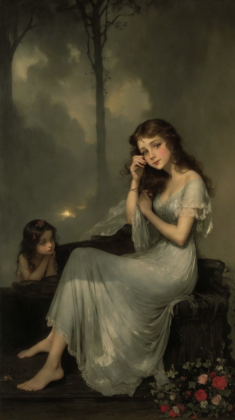 + Prompt:a young girl watching her mother doing all those beautiful, relaxed rituals of beauty and thinking - I want to be like her someday. beauty is ephemeral, finite, which evokes a certain melancholia,