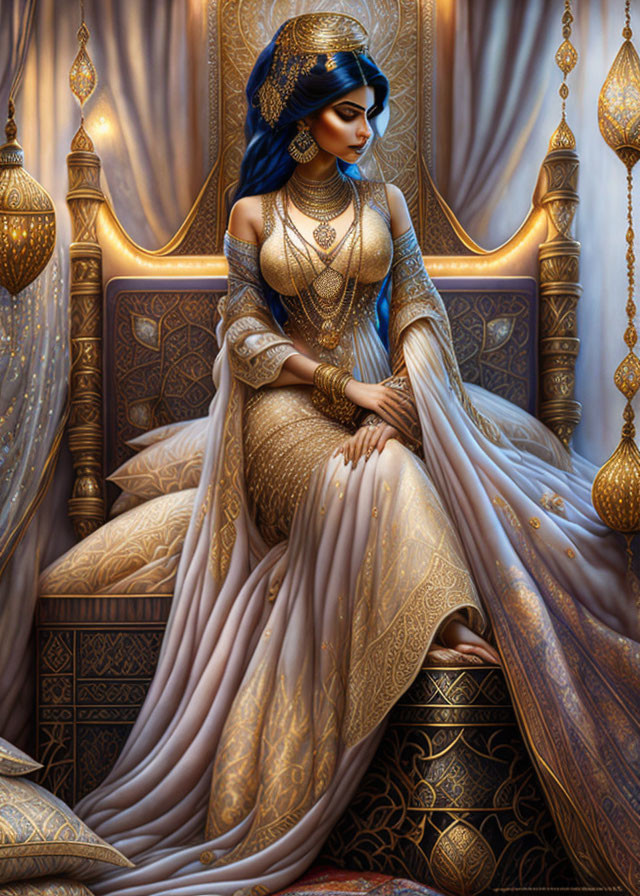 Beautiful Persian woman getting ready for bed. Sumptuous bedroom.