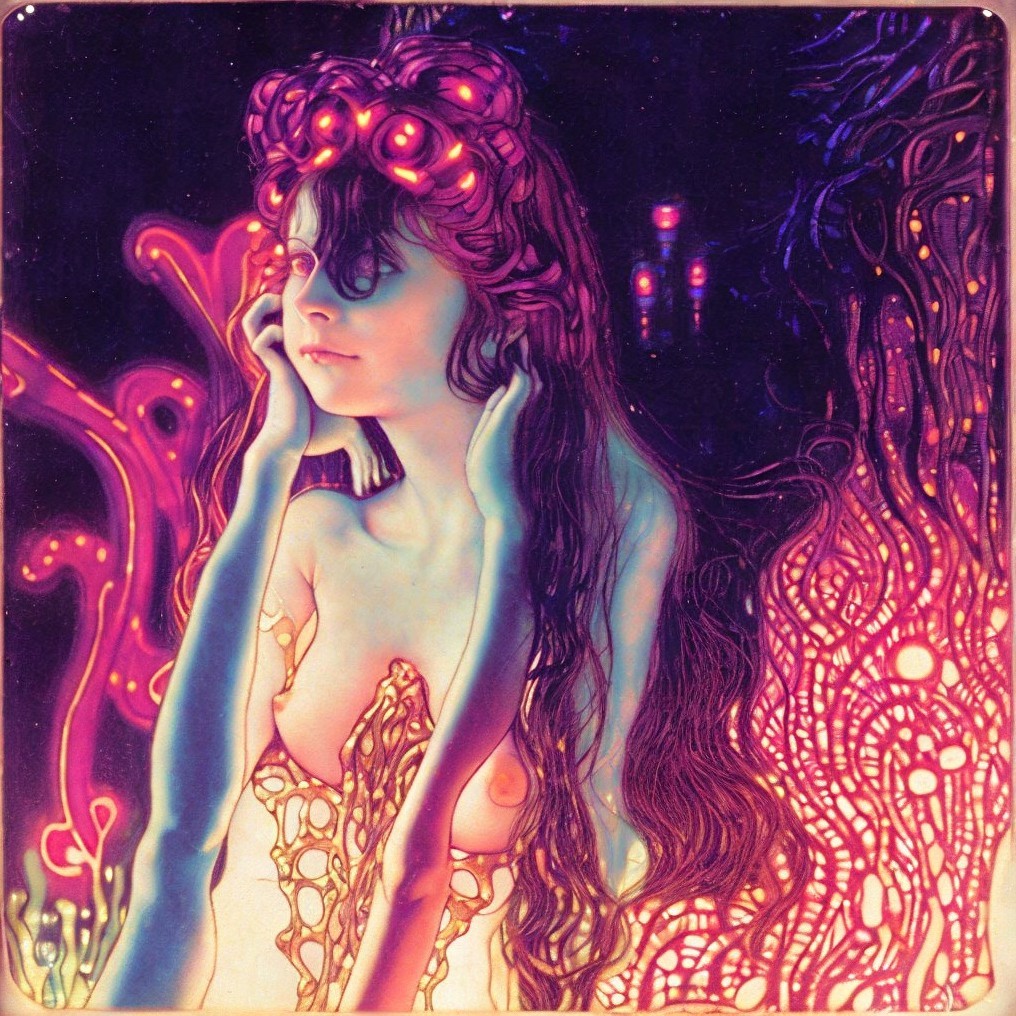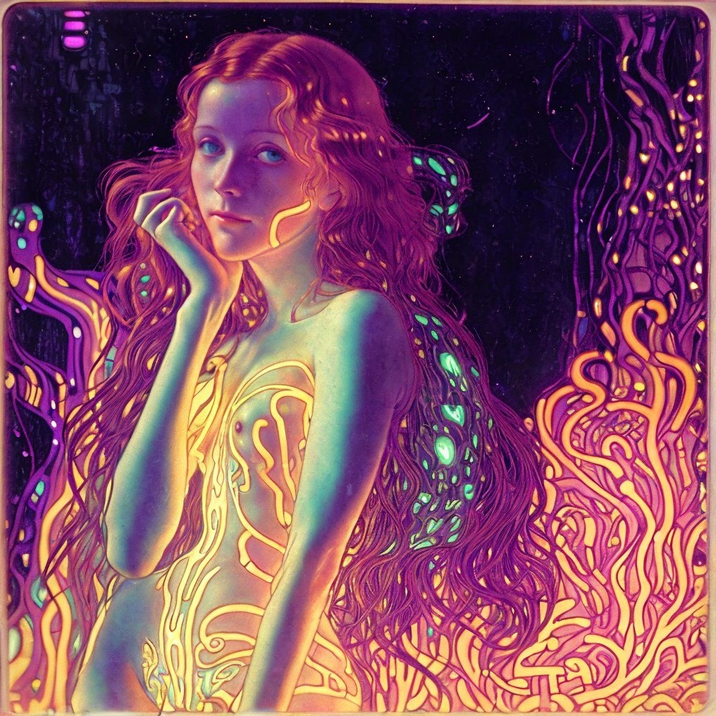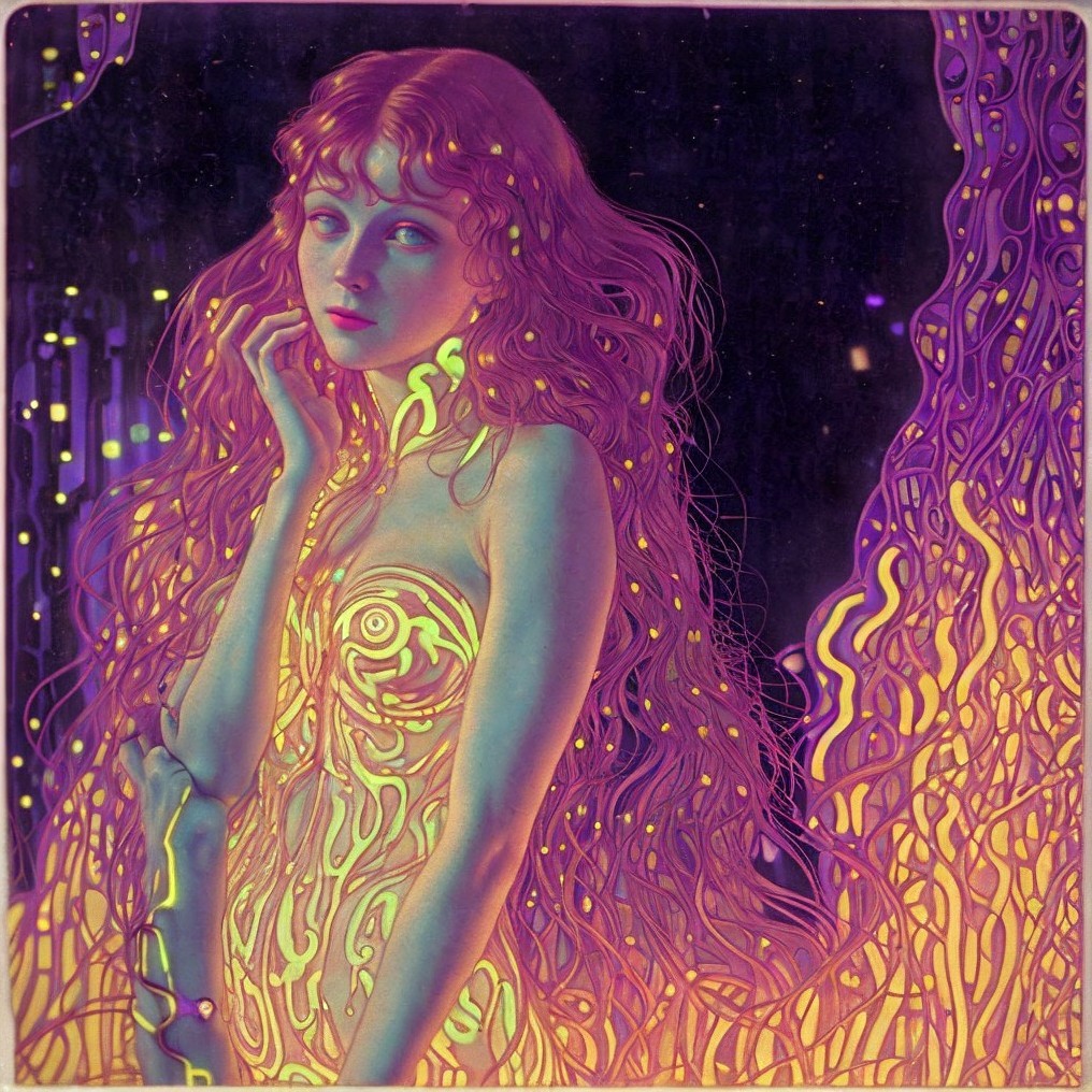 Vibrant stylized woman with flowing hair in purple and yellow against pixelated backdrop