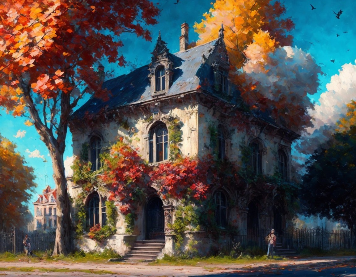 Prompt: "style by Jean Baptiste Monge, Gothic construction style old building on the street, front facade, trees, people, clouds in the sky, clouds, autumn, made in the technique of acrylic painting, painted impasto, wide textured strokes, knife, splashes and drops, saturated with bright colors, the image is in a free, impressionistic style. Against the background of buildings you can see the sky with white clouds, colored, intricate detailed"