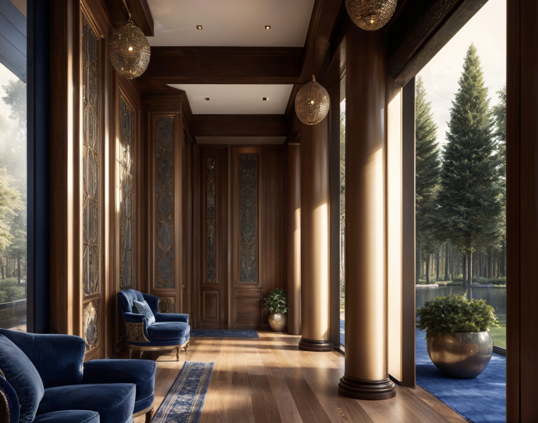 A luxurious room features rich wooden paneling, elegant chandeliers, and plush blue chairs, bathed in natural light from large windows showcasing a scenic forest view.