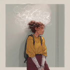 Young woman in yellow sweater with curly hair and smoke