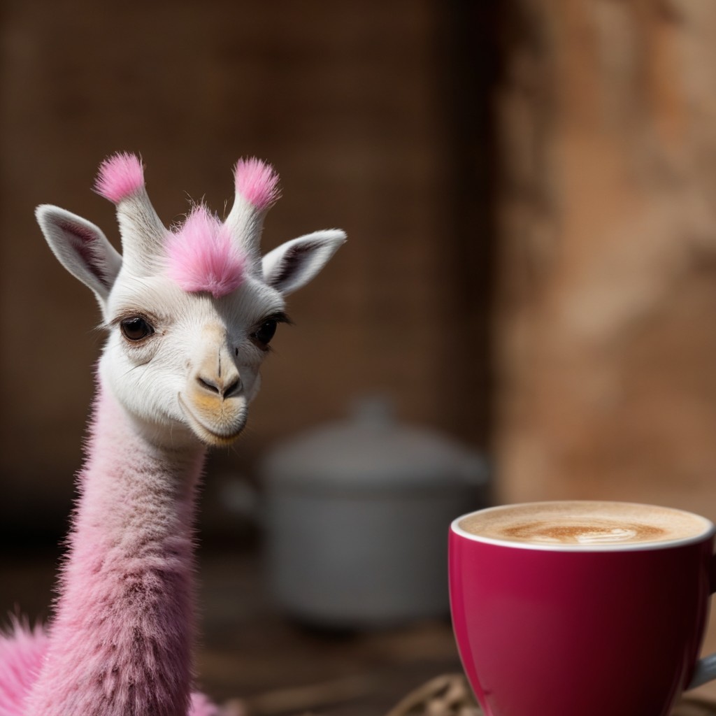 A pink-haired alpaca with a humorous expression sitting at a table with a cup of coffee with latte art, surrounded by cozy, rustic decor.