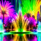 A vibrant, colorful fountain displays a dazzling array of lights against a nighttime backdrop, surrounded by palm trees. Fireworks illuminate the sky, reflecting beautifully in the water below.