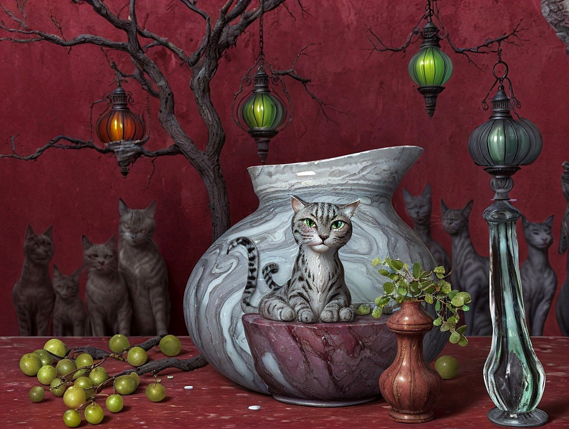 Smooth, still life with depth of field, smooth, finely painted oil painting, rough ceramic vessel with cat, black pupils, detailed fur, bright grey three-dimensional depicted bare branches, fig, transparent glass Bastet statue in cat form, transparent lace, fruits, street lamp on a tall column, in the background cats, sharpen, marbled as if dark red paint and a little blue and green were flowing cloud-like, shiny, reflective tiled floor, slick, plain, inspired by Balthasar van der Ast