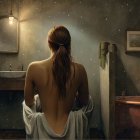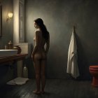 A solitary figure in a long black dress stands near a window in a dimly lit room. A wooden table holds books and a vase of flowers, while a red upholstered chair adds a touch of color.
