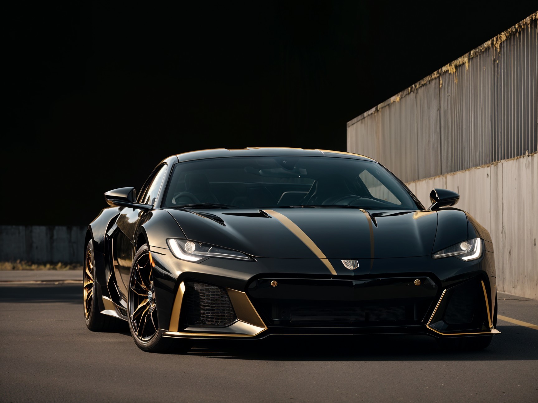 A sleek, black sports car with sharp lines and aggressive styling sits under dramatic lighting. Its intense headlights and low stance highlight its powerful, performance-oriented design.