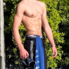 A shirtless man stands serenely with his head tilted back, gazing at the moon. Surrounding him are vibrant blue skies and lush green trees, creating a calm and reflective atmosphere.