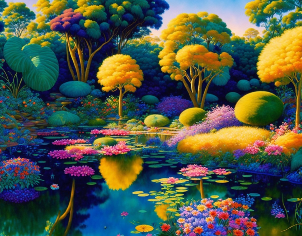 Wide view, 3D watercolor patchwork, a pond reflecting a beautiful Tingatinga style garden with numerous flowers with vibrant saturated colors, slender trees, plants with delicate leaves in shades of azure blue and teal and gold, golden sunrise rays shimmering over the scene, detailed intricate, satiny, high quality, elegant, highly detailed, glistening magic style, by Maxfield Parrish, with elements in the style of Jan Toorop, and elements in the very best style of Gustav Klimt
