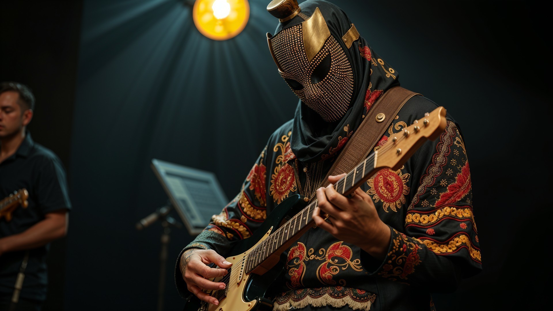 A masked guitarist in a richly embroidered black jacket plays passionately under dramatic lighting. Another musician accompanies him, creating an atmosphere of intense performance.