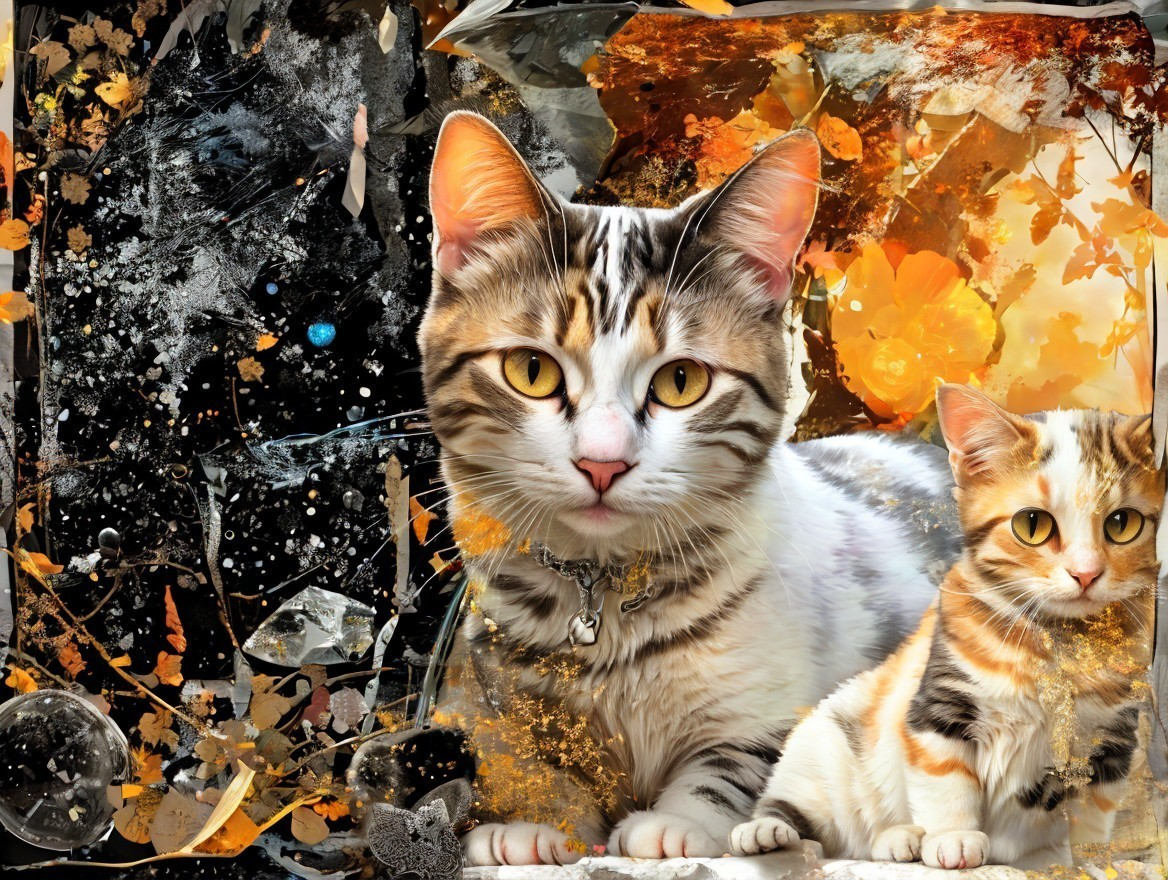 Two cats with striking markings against a dynamic abstract background with autumnal colors and black splatters.