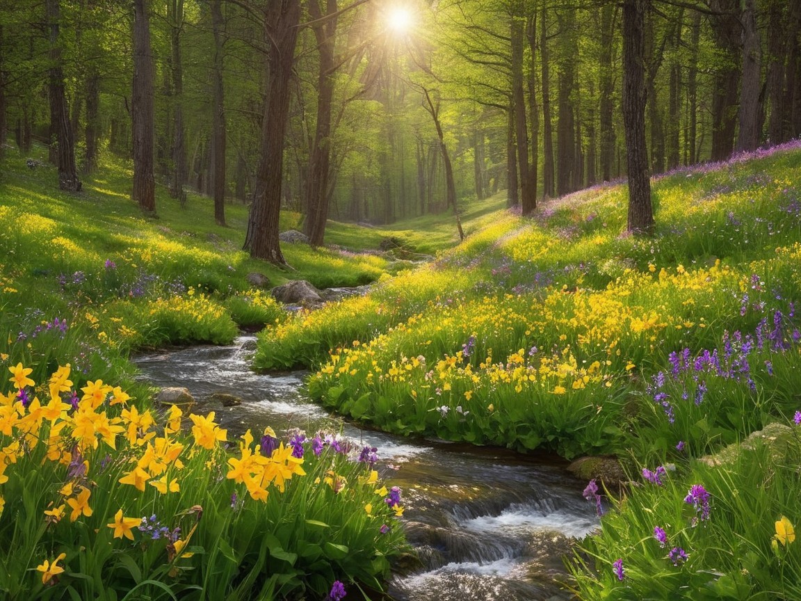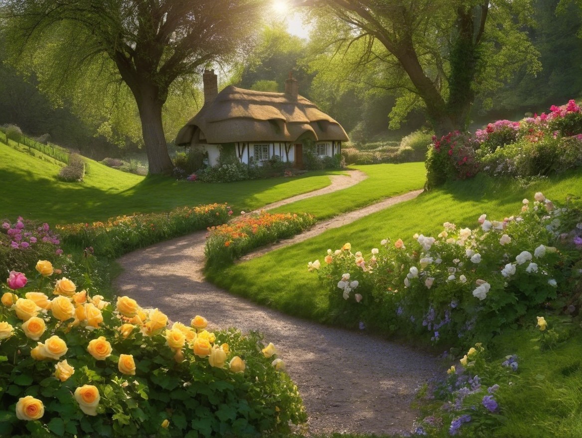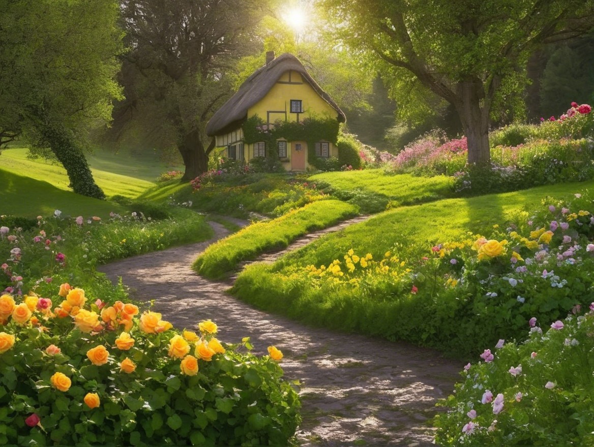 A charming thatched cottage nestled among lush greenery, surrounded by blooming flowers and a serene stream. Sunlight filters through trees, creating a picturesque and tranquil scene.