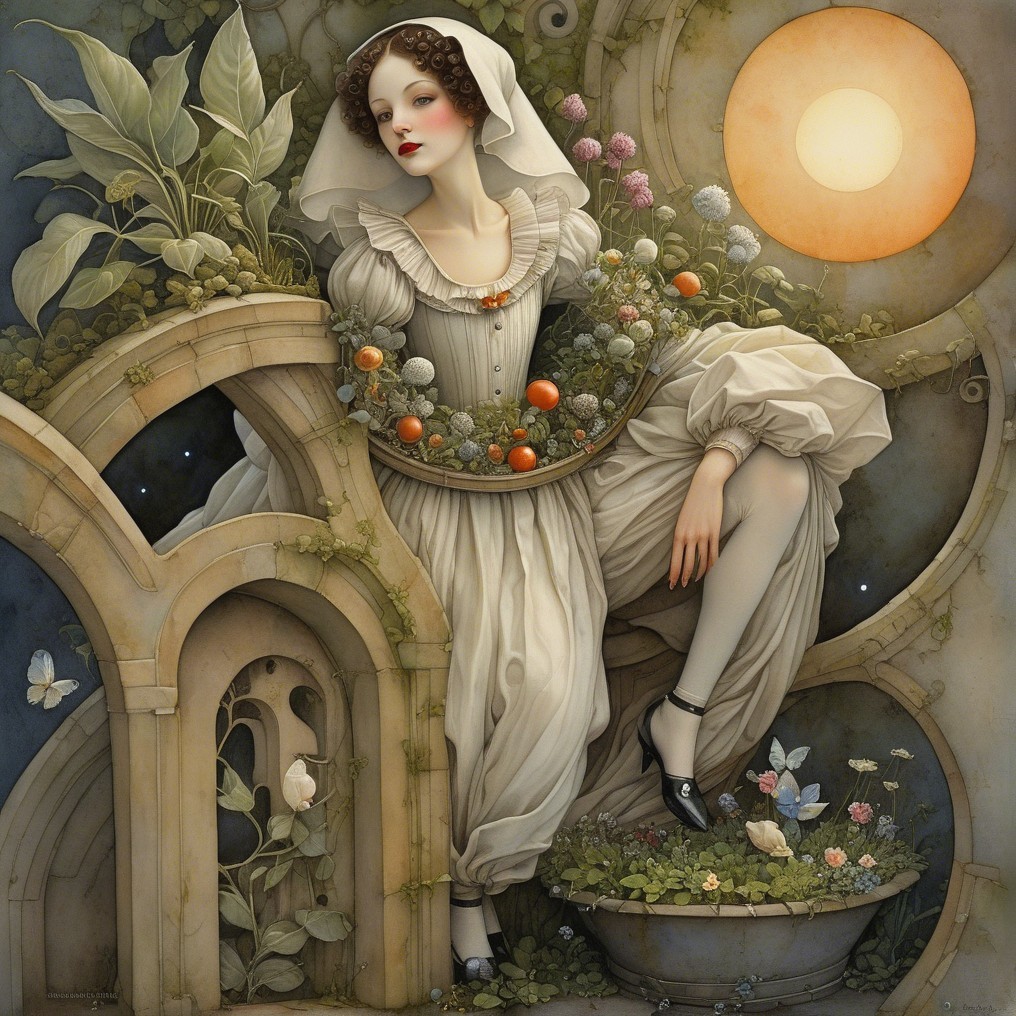 Close up, impish mischievous gorgeous Pierrot creature with a staring into a portal in a garden maze, in the style of Alexander Jansson. by Catrin Welz-Stein, Michael Parkes. By Rob Gonsalves, Markus Pierson